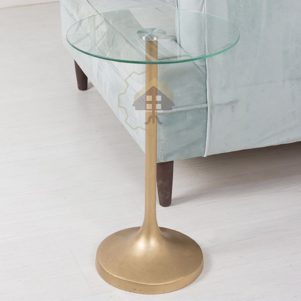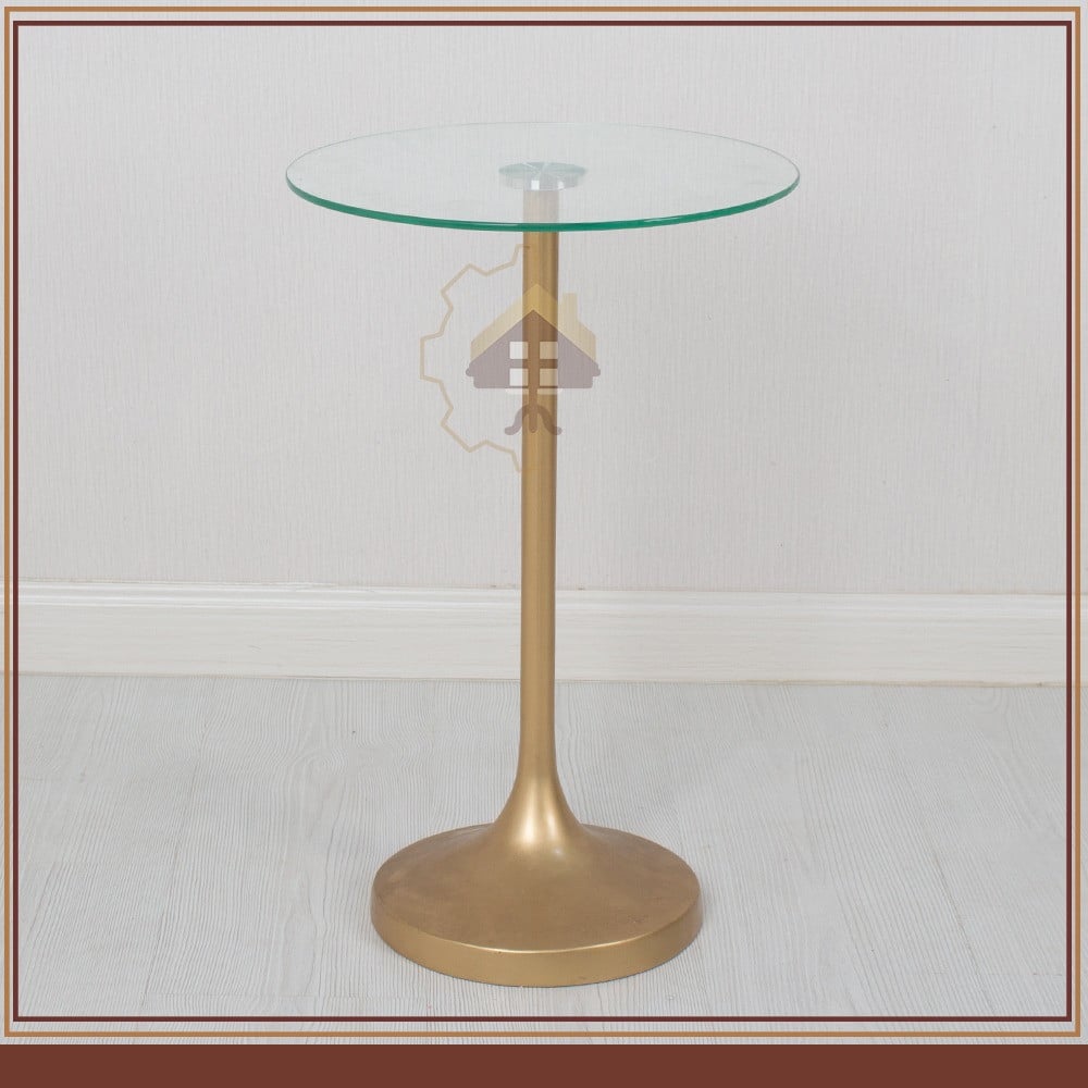 إليك وصفًا مفصلًا لطاولة الخدمة المميزة هذه بسطح زجاجي شفاف وقاعدة من الرخام الصناعي باللون الذهبي:
