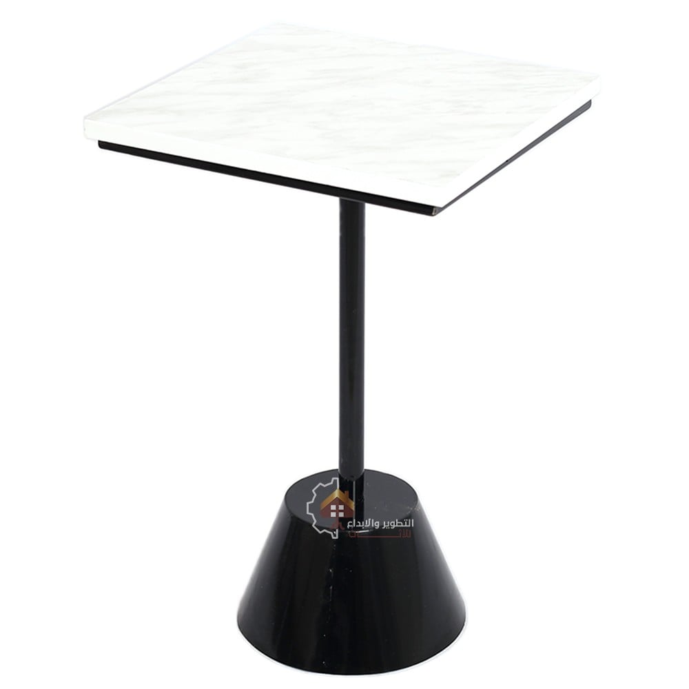 طاولة خدمة شكل مربع القاعدة حديد لون أسود والسطح خشب شبيه الرخام لون أبيض معرق
