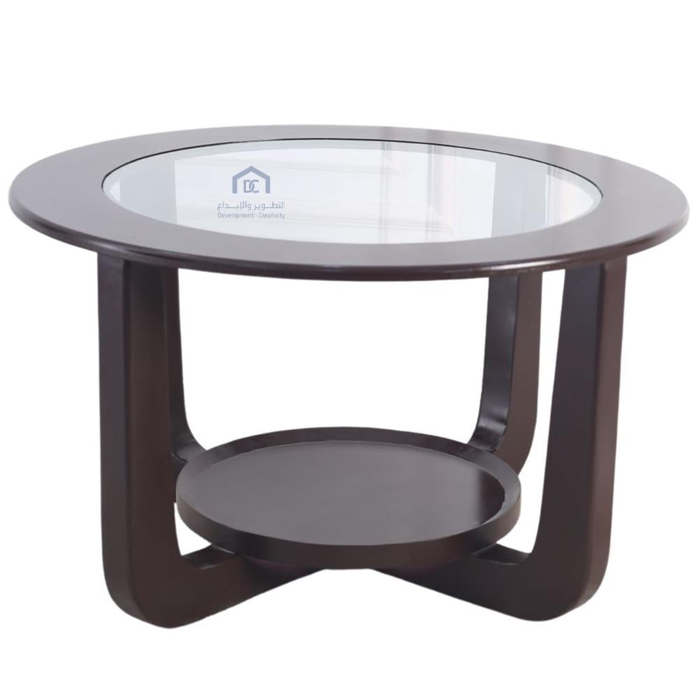 طاولة قهوة دائري خشب لون بني سطح زجاج شفاف