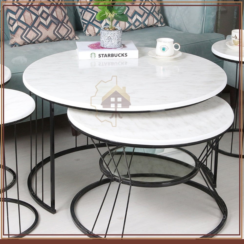 نوع المنتج : طقم طاولتين لون أسود مع 4 حبات طاولات صغيرة خدمة بسطح خشب لون أبيض شبيه الرخام + زجاج